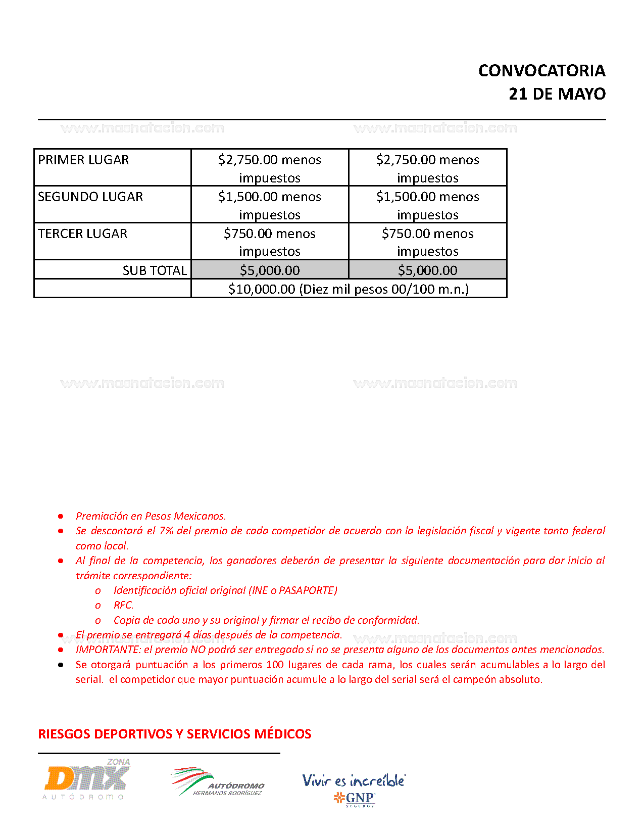 Se descontará el 7% del premio de cada competidor de acuerdo con la legislación fiscal y vigente tanto federal como local.